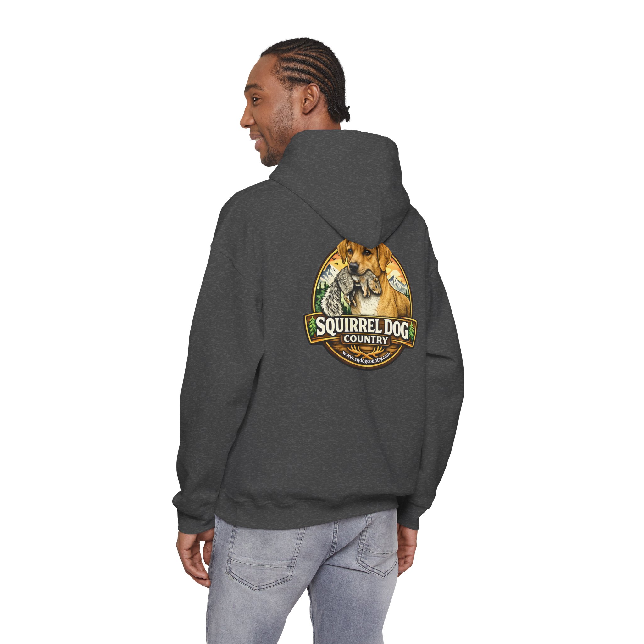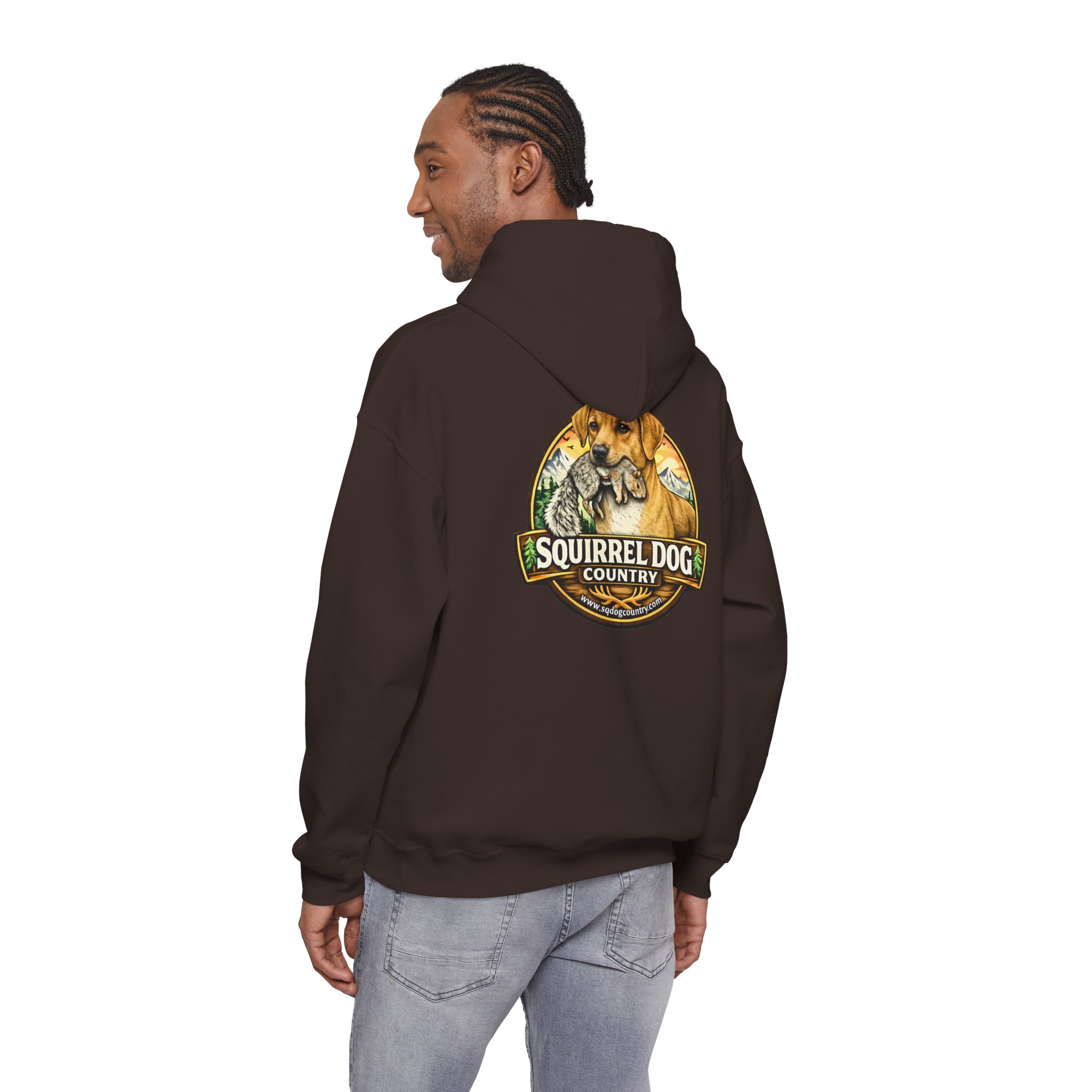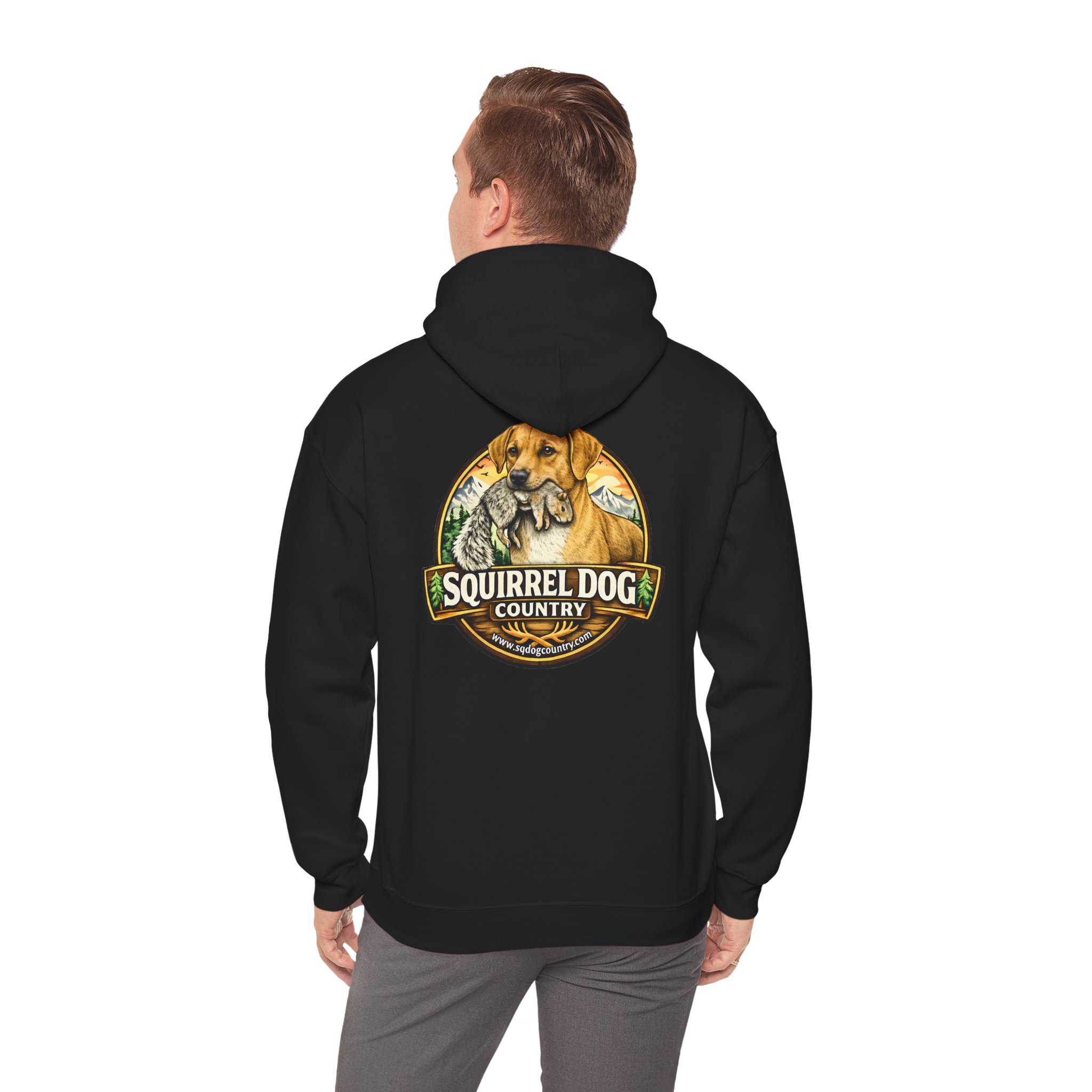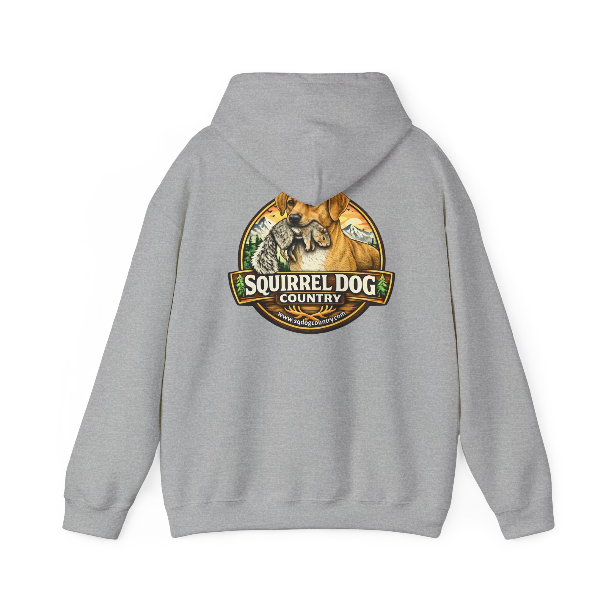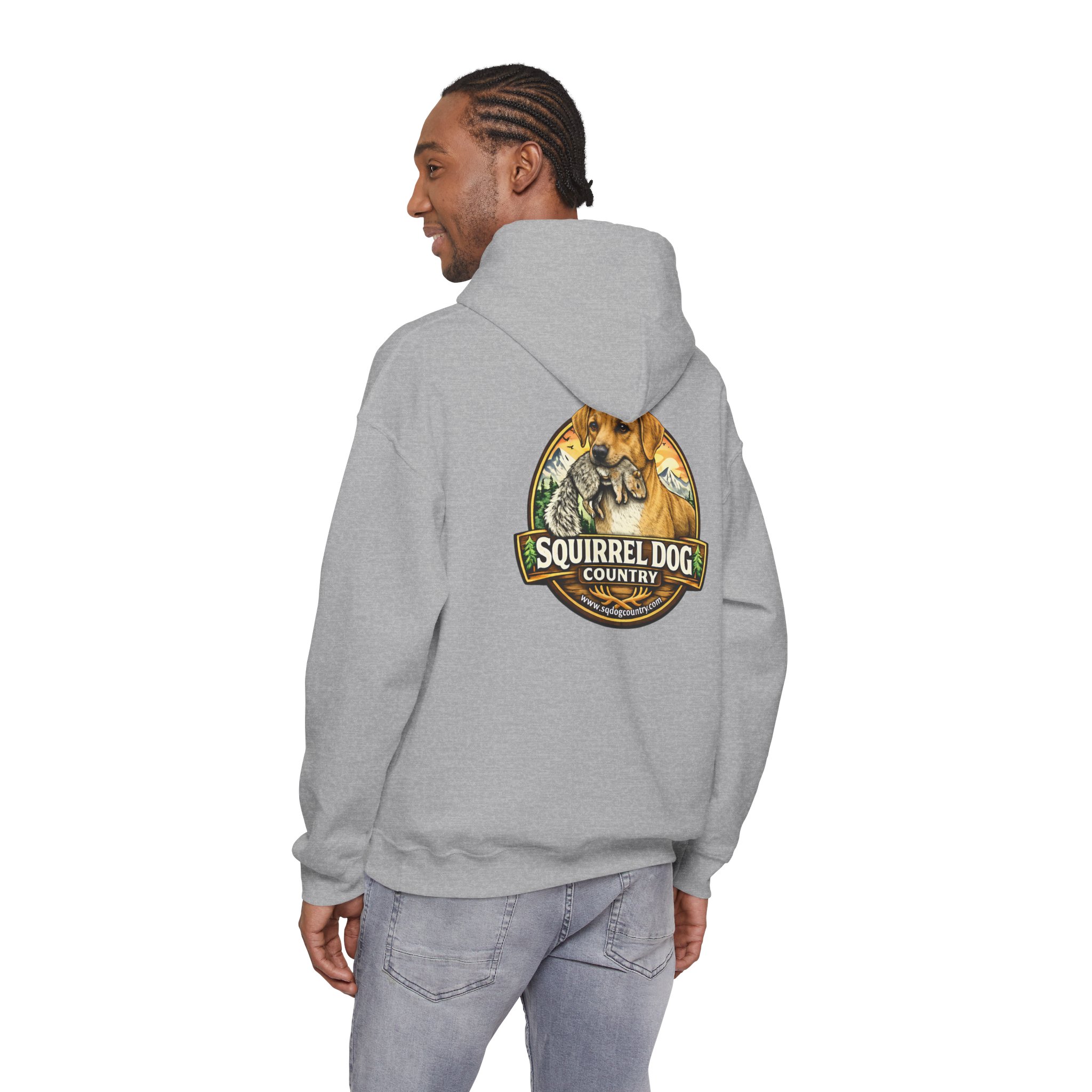 A cozy, midweight hooded sweatshirt made for people who live for woodland weekends and slow mornings with a loyal pup at their side. The soft 50/50 cotton–poly blend holds rich prints and resists shrinking, while the double-lined hood and color-matched drawcord add durable, thoughtful details. A roomy kangaroo pocket keeps hands warm between hikes, and the classic fit sits comfortably over layers. The back sports a rustic, outdoorsy emblem featuring a cheerful dog and forest motif — a quiet nod to country trails, squirrel-chasing afternoons, and campfire stories. Wear it on chilly mornings, at trailheads, or when you just want to bring a little wilderness into your everyday rhythm.